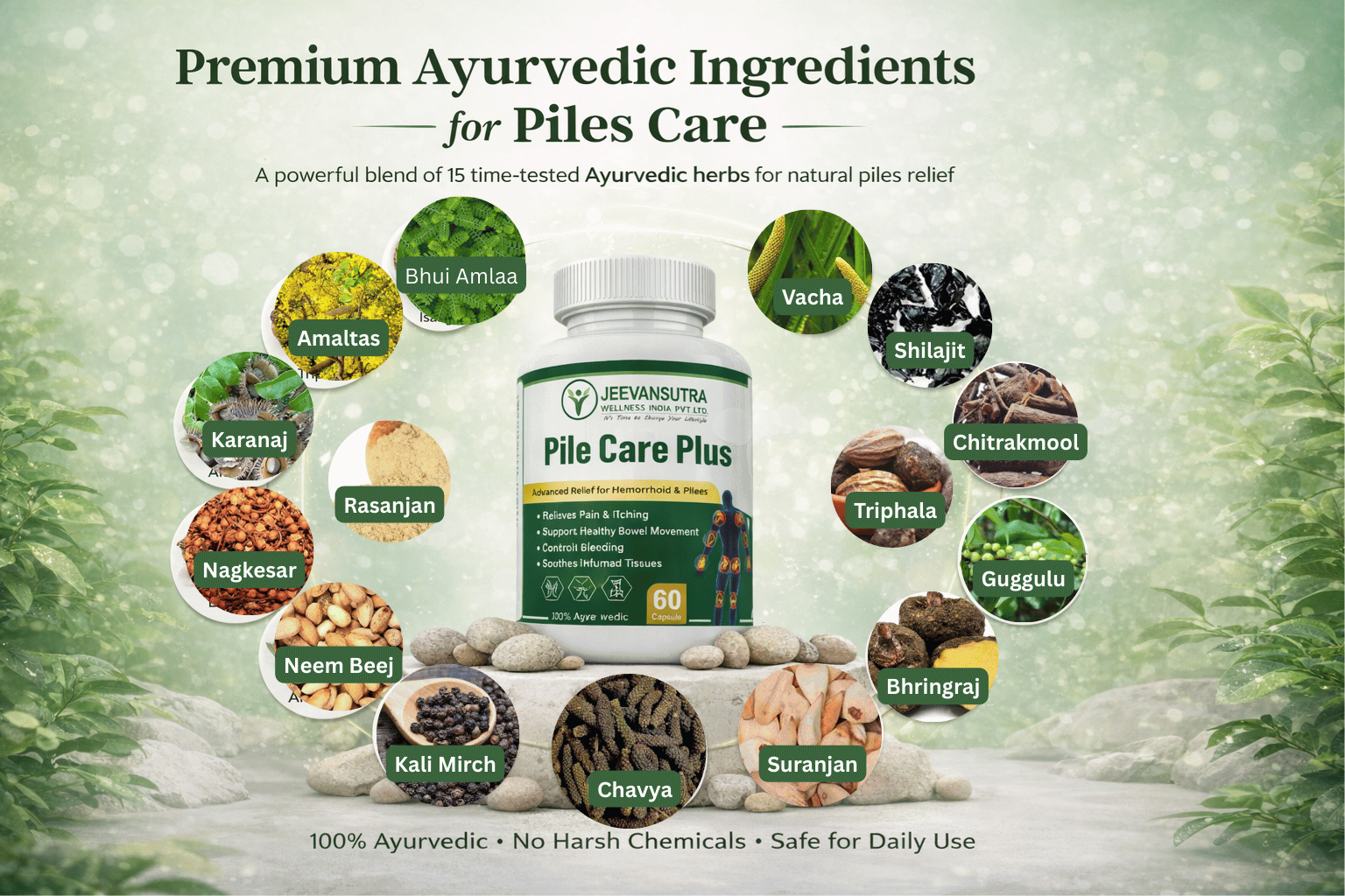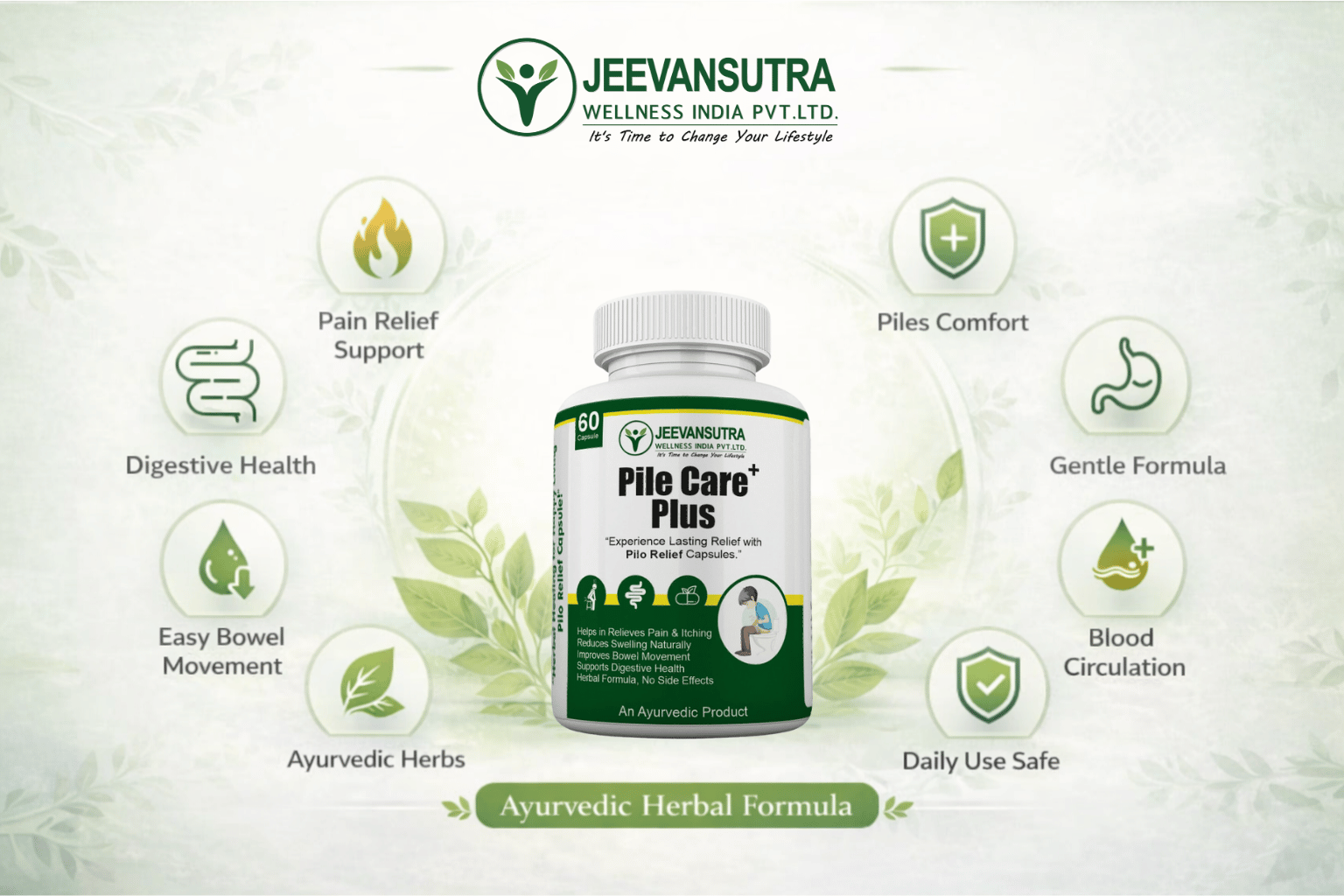 Clinically Inspired • Ayurvedic Formula Jeevansutra Piles Care Plus – Gentle Relief. Everyday Comfort. Jeevansutra Piles Care Plus Capsules are specially formulated with powerful Ayurvedic herbs to support relief from piles discomfort, promote easy bowel movement, improve digestive health, and provide soothing comfort for daily well-being. Vendor: Jeevansutra Availability: In stock Product type: Capsule